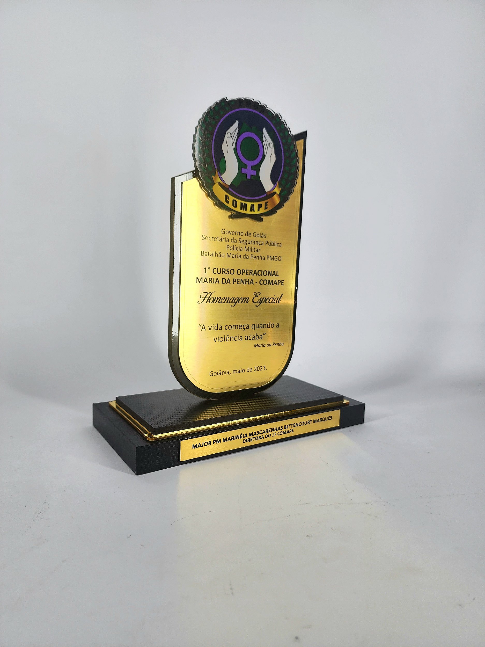 PLACA EM MDF BLCK PIANO E FACE EM ABS DOURADO ESCOVADO COM BRASÃO EM ALTO RELEVO