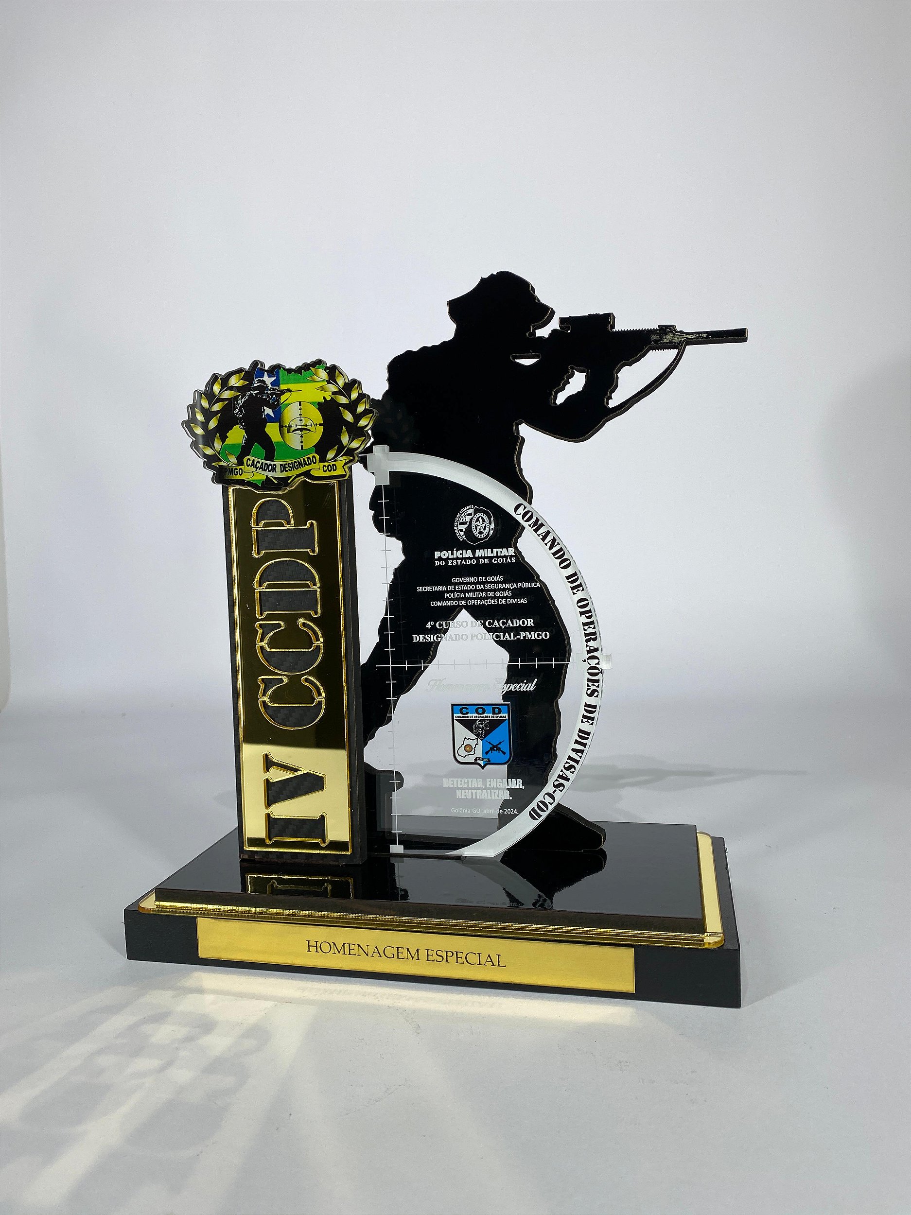 PLACA EM ACRILCO CRISTAL COM ATIRADOR EM MDF BLCK PIANO E TOTEM LATERAL DOURADO ESPELHADO